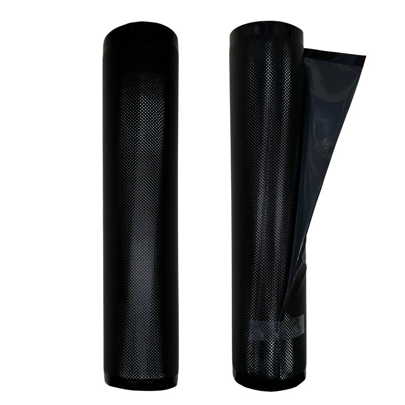 Black vacuum sealer bags with clear front. The black side protects items from light, and the clear side allows for easy identification of contents.